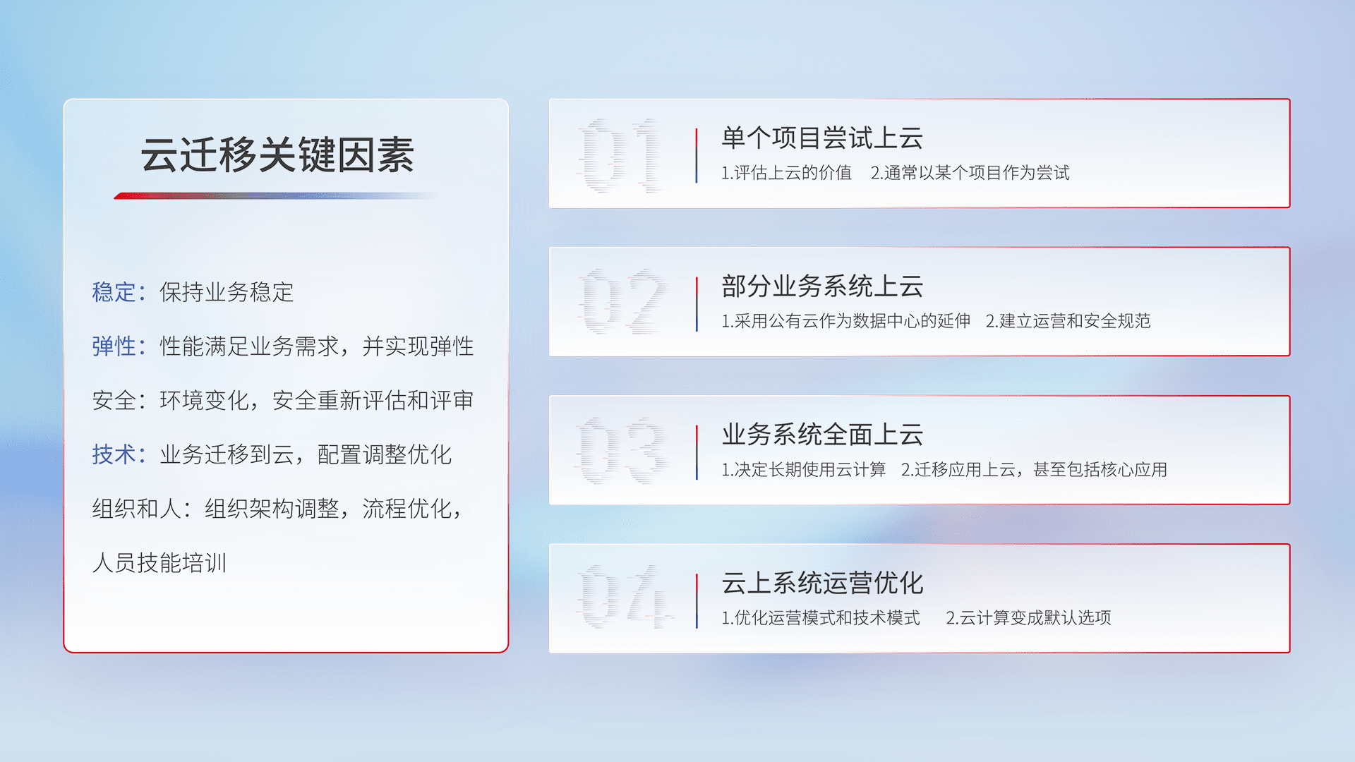结合实际业务,,从规划设计、、云平台选型、、云原生改造、、、数据迁移、、集成交付,,迁移全过程为客户识别最佳上云路径,,做好风险识别管理,,,,设计网络架构、、身份权限、、、、安全审计合规、、、、操作审计、、、、日志审计、、、监控告警策略、、、、多站点容灾设计等,,,,对云上基础设施进行整体规划,,,,提升IT治理水平,,以满足弹性、、、、高可用、、高性能的需求。。