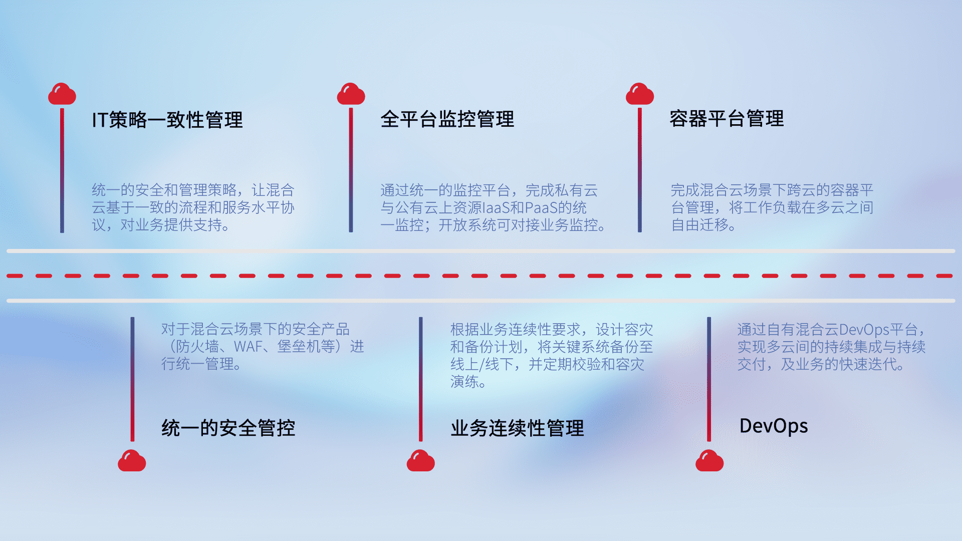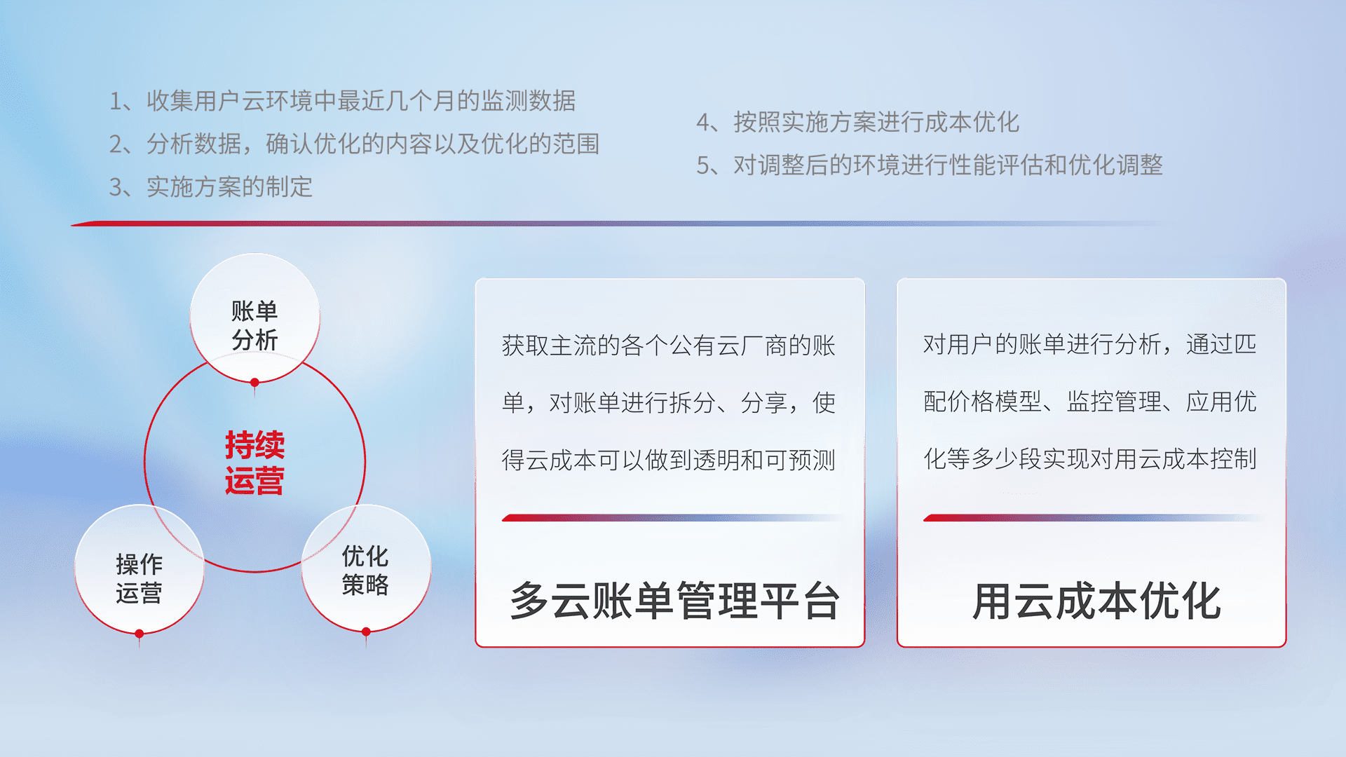 通过多云纳管,,,以统一的资源数据模型把客户的云资源进行抽象和封装,,进而实现对多云资源的统一操作,,保障云资源管理的可靠性、、、稳定性与可用性。。。量身定制化运维内容,,,,配置、、、、开发运维、、、补丁管理、、、备份、、、监控、、、、认证和访问管理、、、、审计和日常巡检等,,,保障在用云过程中的可靠度,,,稳定度以及高可用率。。