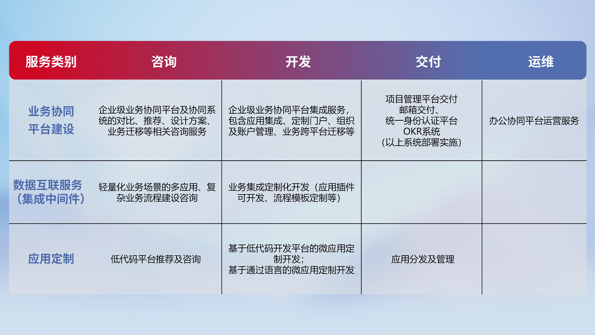 针对钉钉、、、、企微、、、、IDaas等平台级产品提供产品的规划、、、方案、、交付、、定制化开发等服务,,,实现如统一协同办公、、、、智能客户服务、、、混合会议管理、、、、智能数据查询、、等业务场景,,实现数字化转型。。。